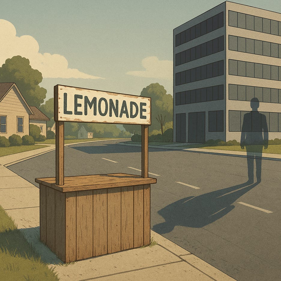 Imagine you’re twelve, and you have a lemonade stand. You make a modest profit—enough to keep going—and you like the lemonade stand. You talk to your neighbors. When someone quenches their thirst on a hot day, the relief on their face makes you smile. You run the lemonade stand with your siblings, bonding while everyone makes a little spending money.